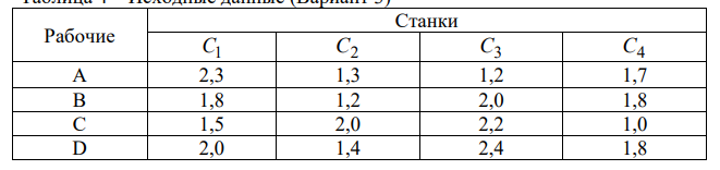 Решить задачу о назначениях средствами Excel. Цеху металлообработки нужно выполнить срочный заказ на производство деталей. Каждая деталь обрабатывается на 4-х станках С1 , С2 , С3 и С4 . На каждом станке может работать любой из четырех рабочих А, B, C и D. Однако, каждый из них имеет на каждом станке различный процент брака. Из документации ОТК имеются данные о проценте брака каждого рабочего на каждом станке, которые представлены в таблице. Необходимо так распределить рабочих по станкам, чтобы суммарный процент брака, который равен сумме процентов брака всех 4-х рабочих, был минимален. Чему равен этот процент?