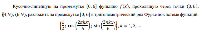Кусочно-линейную на промежутке [0; 6] функцию 𝑓(𝑥), проходящую через точки (0; 6), (4; 9), (6; 9), разложить на промежутке [0; 6] в тригонометрический ряд Фурье по системе функций: