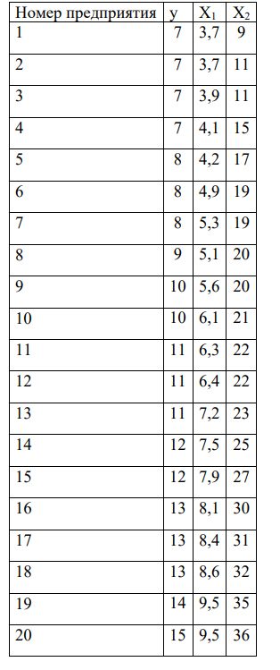 По предприятиям региона изучается зависимость выработки продукции на одного работника y (тыс. руб.) от ввода в действие новых основных фондов x1 ( от стоимости фондов на конец года) и от удельного веса рабочих высокой квалификации в общей численности рабочих x2 (%)