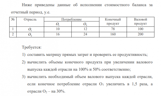 Требуется: 1) составить матрицу прямых затрат и проверить ее продуктивность; 2) вычислить объемы конечного продукта при увеличении валового выпуска каждой отрасли на 100% и 50% соответственно; 3) вычислить необходимый объем валового выпуска каждой отрасли, если конечное потребление отрасли О1 увеличить в 1,5 раза, а отрасли О2 – на 30%.