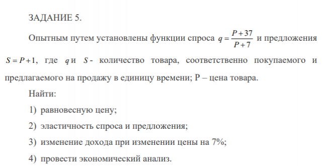 и предложения S = P + 1 , где q и S - количество товара, соответственно покупаемого и предлагаемого на продажу в единицу времени; Р – цена товара. Найти: 1) равновесную цену; 2) эластичность спроса и предложения; 3) изменение дохода при изменении цены на 7%; 4) провести экономический анализ.