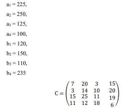Поставщики товара – оптовые коммерческие предприятия – А1, А2,…Аm имеют запасы товаров соответственно в количестве а1, а2,…аm ед. и розничные торговые предприятия В1, В2,…Вn – подали заявки на закупку товаров в объемах соответственно b1, b2,…bn. Тарифы перевозок единицы груза с каждого из пунктов поставки в соответствующие пункты потребления заданы в виде матрицы С = (сij, i=1̅̅,̅m̅̅, j = 1̅̅̅,̅𝑛̅). Найти такой план перевозки груза от поставщиков к потребителям, чтобы совокупные затраты на перевозку были минимальными.