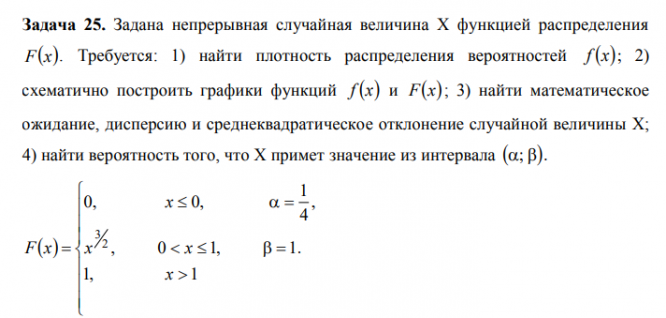 Задана непрерывная случайная величина Х функцией распределения . Требуется: 1) найти плотность распределения вероятностей; 2) схематично построить графики функций ; 3) найти математическое ожидание, дисперсию и среднеквадратическое отклонение случайной величины Х; 4) найти вероятность того, что Х примет значение из интервала