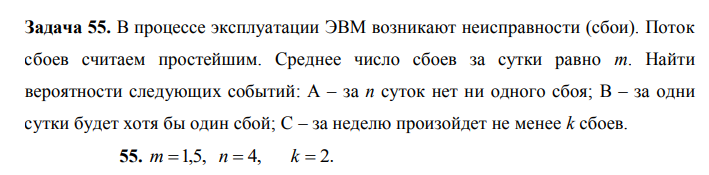 В процессе эксплуатации ЭВМ возникают неисправности (сбои). Поток сбоев считаем простейшим. Среднее число сбоев за сутки равно m. Найти вероятности следующих событий: А – за n суток нет ни одного сбоя; В – за одни сутки будет хотя бы один сбой; С – за неделю произойдет не менее k сбоев.