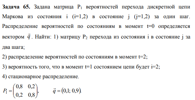 Задана матрица Р1 вероятностей перехода дискретной цепи Маркова из состояния i (i=1,2) в состояние j (j=1,2) за один шаг. Распределение вероятностей по состояниям в момент t=0 определяется вектором q . Найти: 1) матрицу Р2 перехода из состояния i в состояние j за два шага; 2) распределение вероятностей по состояниям в момент t=2; 3) вероятность того, что в момент t=1 состоянием цепи будет i=2; 4) стационарное распределение