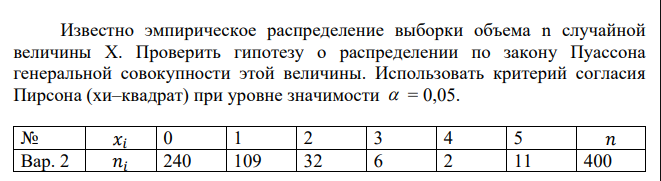 Известно эмпирическое распределение выборки объема n случайной величины Х. Проверить гипотезу о распределении по закону Пуассона генеральной совокупности этой величины. Использовать критерий согласия Пирсона (хи–квадрат) при уровне значимости = 0,05.