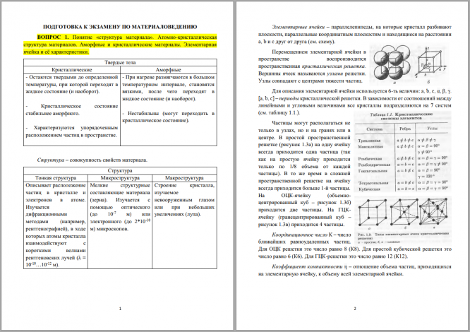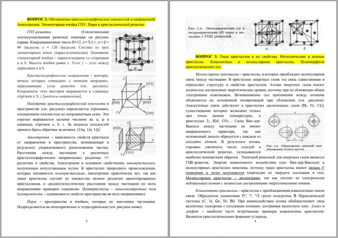 1. Понятие «структура материала». Атомно-кристаллическая структура материалов. Аморфные и кристаллические материалы. Элементарная ячейка и её характеристики. 2. Обозначение кристаллографических плоскостей и направлений. Анизотропия. Элементарная ячейка ГПУ. Поры в кристаллической решетке. 3. Типы кристаллов и их свойства. Металлические и ионные кристаллы. Ковалентные и молекулярные кристаллы. Полиморфизм кристаллических тел. 4. Понятия «сплав», «фаза». Виды фаз. Твёрдые растворы. Промежуточные фазы. Промежуточные фазы с металлической связью, фазы внедрения. Анизотропия. 5. Понятия «сплав», «фаза». Виды фаз. Дефекты кристаллического строения: точечные, линейные, поверхностные, объёмные.