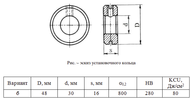Пользуясь «Марочником сталей и сплавов», выбрать марку стали для изготовления установочного кольца (см. эскиз). Производство колец серийное. Для решения задачи использовать данные согласно выданному варианту домашнего задания (см. табл.): основные размеры кольца, предел текучести стали σ0,2 (не менее), твёрдость стали НВ (не менее), ударная вязкость KCU (не менее). Обосновать сделанный выбор стали, рекомендовать упрочняющую обработку кольца, которая обеспечит его работоспособность в предлагаемых условиях.