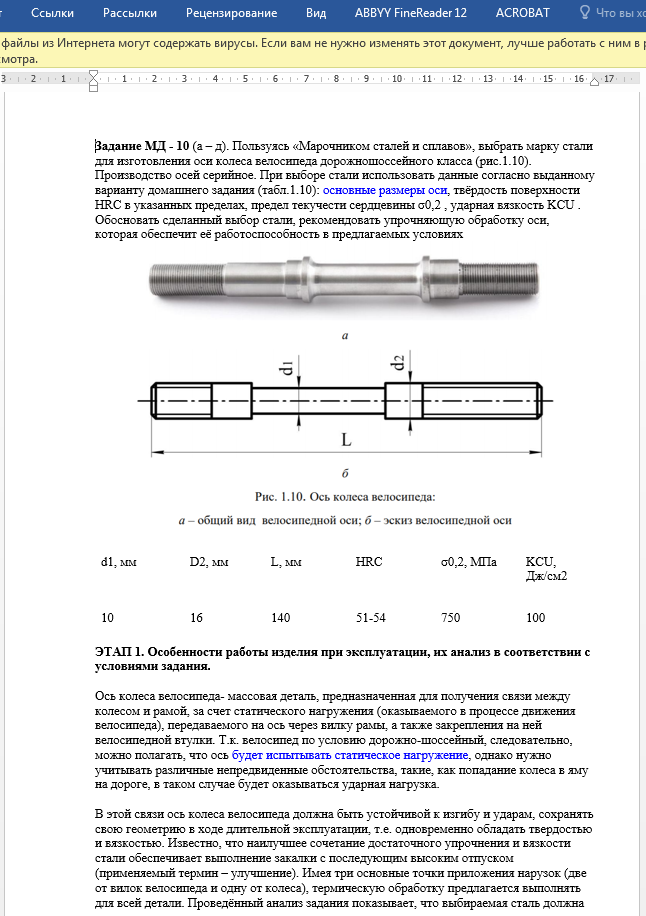 мы ыы нвс в02.МПа КСО, Дюсы 10 16 140 51-54 150 100 ЭТАП 1. Особенности работы изделия при эксплуатации, их анализ в соответствии с условиями задания, Ось колеса пелосипеда- массовая деталь предназначенная для получения связи между колесом ип рамой, за счет статического ныгружения (оказываемого в прошессе движения велосипеда) передаваемого на ссь через вильу рамы, атаке закрепления ва ней велосипедной втулки. Тх. велосипед по условию дорожночшоссейный, следовательно, можно полагать что ось будет испытывать статическое нагружение, одако нужно учитывать различные непредвиденные обстоятельства такие, как попадание колеса в яму на дороге, в лаком случае будет оказываться ударная нагрузка.