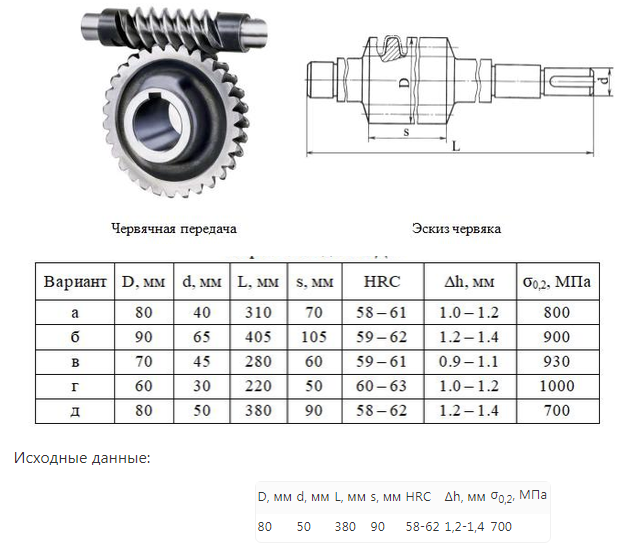 Для решения задачи использовать данные согласно выданному варианту домашнего задания (см. табл.): основные размеры червяка, твёрдость поверхности трения HRC и глубина упрочнённого слоя Δh в указанных пределах, предел текучести сердцевины σ0,2 (не менее).