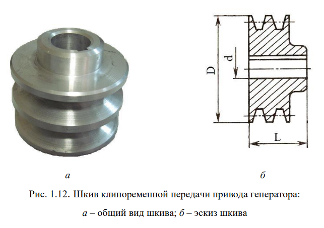 Задание МД - 12 (а – д). Пользуясь «Марочником сталей и сплавов», выбрать марку стали для изготовления шкива клиноременной передачи привода генератора (рис.1.12). Производство шкивов серийное. При выборе стали использовать данные согласно выданному варианту домашнего задания (табл.1.12): основные размеры шкива, предел текучести сердцевины σ0,2 (не менее), твёрдость сердцевины HB (не менее). Обосновать сделанный выбор стали, рекомендовать упрочняющую обработку шкива, которая обеспечит его работоспособность в предлагаемых условиях.