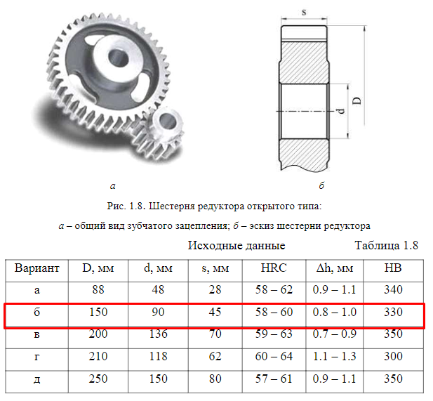 Задание МД - 8 (а – д). Пользуясь «Марочником сталей и сплавов», выбрать марку стали для изготовления шестерни редуктора открытого типа для привода транспортёрной ленты, эксплуатируемой на горнообогатительном комбинате (рис.1.8). Производство редукторов единичное. При выборе стали использовать данные согласно выданному варианту домашнего задания (табл.1.8): основные размеры шестерни, твёрдость поверхности зубьев HRC и глубина упрочнённого слоя Δh в указанных пределах, твердость сердцевины НВ (не менее). Обосновать сделанный выбор стали, рекомендовать обработку шестерни, которая обеспечит его работоспособность в предлагаемых условиях. ![]()