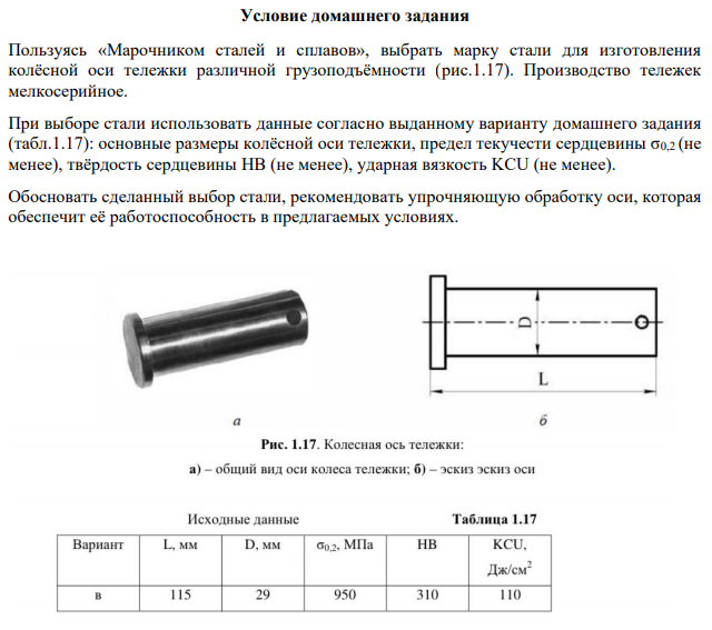 Условие домашнего задания МД 17 ВПользуясь «Марочником сталей и сплавов » , выбрать марку стали для изготовления колёсной оси тележки различной грузоподъёмности (рис.1.17). Производство тележек мелкосерийное. При выборе стали использовать данные согласно выданному варианту домашнего задания (табл.1.17): основные размеры колёсной оси тележки, предел текучести сердцевины σ0,2 (не менее), твёрдость сердцевины HB (не менее), ударная вязкость KCU (не менее). Обосновать сделанный выбор стали, рекомендовать упрочняющую обработку оси, которая обеспечит её работоспособность в предлагаемых условиях.