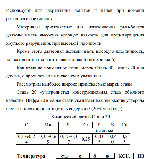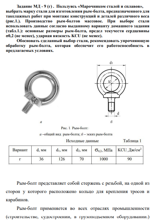 Задание МД - 9 (г) .Пользуясь «Марочником сталей и сплавов » , выбрать марку стали для изготовления рым-болта, предназначенного для такелажных работ при монтаже конструкций и деталей различного веса (рис.1.). Производство рым-болтов массовое. При выборе стали использовать данные согласно выданному варианту домашнего задания (табл.1.): основные размеры рым-болта, предел текучести сердцевины σ0,2 (не менее), ударная вязкость KCU (не менее). Обосновать сделанный выбор стали, рекомендовать упрочняющую обработку рым-болта, которая обеспечит его работоспособность в предлагаемых условиях