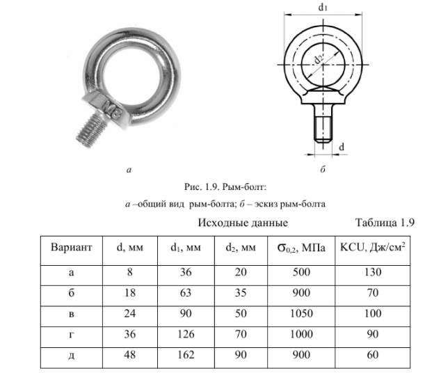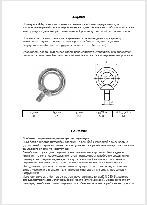 Пользуясь «Марочником сталей и сплавов», выбрать марку стали для изготовления рым-болта, предназначенного для такелажных работ при монтаже конструкций и деталей различного веса. Производство рым-болтов массовое. При выборе стали использовать данные согласно выданному варианту домашнего задания: основные размеры рым-болта, предел текучести сердцевины (не менее), ударная вязкость KCU (не менее).