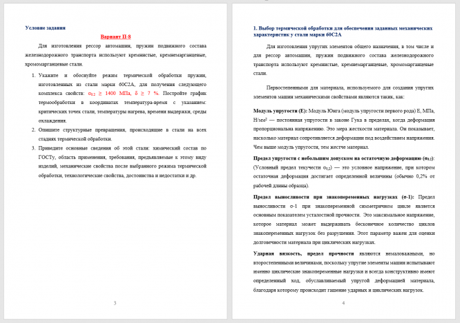 Задание П – 8. Для изготовления рессор автомашин, пружин подвижного состава железнодорожного транспорта используют кремнистые, кремнемарганцевые, хромомарганцевые стали. 1.     Укажите и обоснуйте режим термической обработки пружин, изготовленных из стали марки 60С2А, для получения следующего комплекса свойств: σ0.2 ≥ 1400 МПа, δ ≥ 7 %. Постройте график термообработки в координатах температура-время с указанием: критических точек стали, температуры нагрева, времени выдержки, среды охлаждения. 2.     Опишите структурные превращения, происходящие в стали на всех стадиях термической обработки. 3.     Приведите основные сведения об этой стали: химический состав по ГОСТу, область применения, требования, предъявляемые к этому виду изделий, механические свойства после выбранного режима термической обработки, технологические свойства, достоинства и недостатки и др..