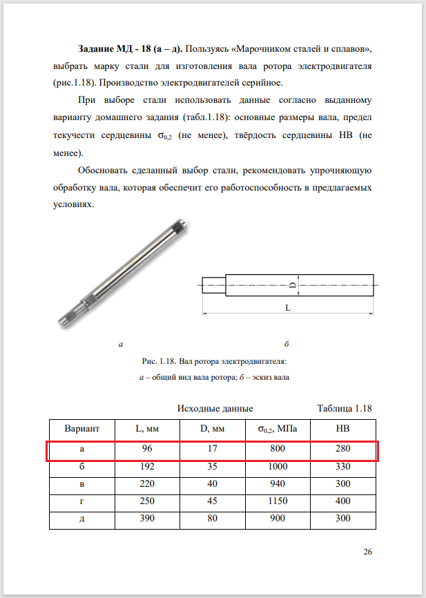 Задание МД - 18 (а – д). Пользуясь «Марочником сталей и сплавов», выбрать марку стали для изготовления вала ротора электродвигателя (рис.1.18). Производство электродвигателей серийное. При выборе стали использовать данные согласно выданному варианту домашнего задания (табл.1.18): основные размеры вала, предел текучести сердцевины σ0,2 (не менее), твёрдость сердцевины HB (не менее). Обосновать сделанный выбор стали, рекомендовать упрочняющую обработку вала, которая обеспечит его работоспособность в предлагаемых условиях..