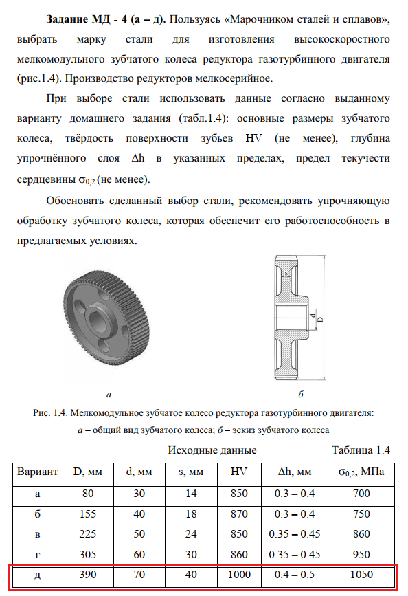 Задание МД - 4 (а – д). Пользуясь «Марочником сталей и сплавов», выбрать марку стали для изготовления высокоскоростного мелкомодульного зубчатого колеса редуктора газотурбинного двигателя (рис.1.4). Производство редукторов мелкосерийное. При выборе стали использовать данные согласно выданному варианту домашнего задания (табл.1.4): основные размеры зубчатого колеса, твёрдость поверхности зубьев HV (не менее), глубина упрочнённого слоя Δh в указанных пределах, предел текучести сердцевины σ0,2 (не менее). Обосновать сделанный выбор стали, рекомендовать упрочняющую обработку зубчатого колеса, которая обеспечит его работоспособность в предлагаемых условиях. .