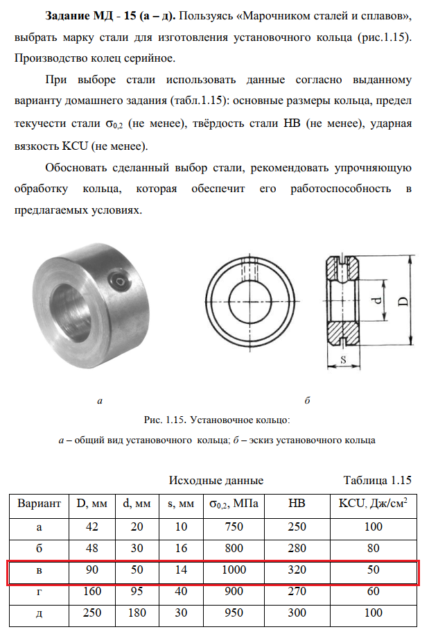 Задание МД - 15 (а – д). Пользуясь «Марочником сталей и сплавов», выбрать марку стали для изготовления установочного кольца (рис.1.15).Производство колец серийное. При выборе стали использовать данные согласно выданному варианту домашнего задания (табл.1.15): основные размеры кольца, предел текучести стали σ0,2 (не менее), твёрдость стали HB (не менее), ударная вязкость KCU (не менее). Обосновать сделанный выбор стали, рекомендовать упрочняющую обработку кольца, которая обеспечит его работоспособность в предлагаемых условиях ..
