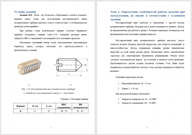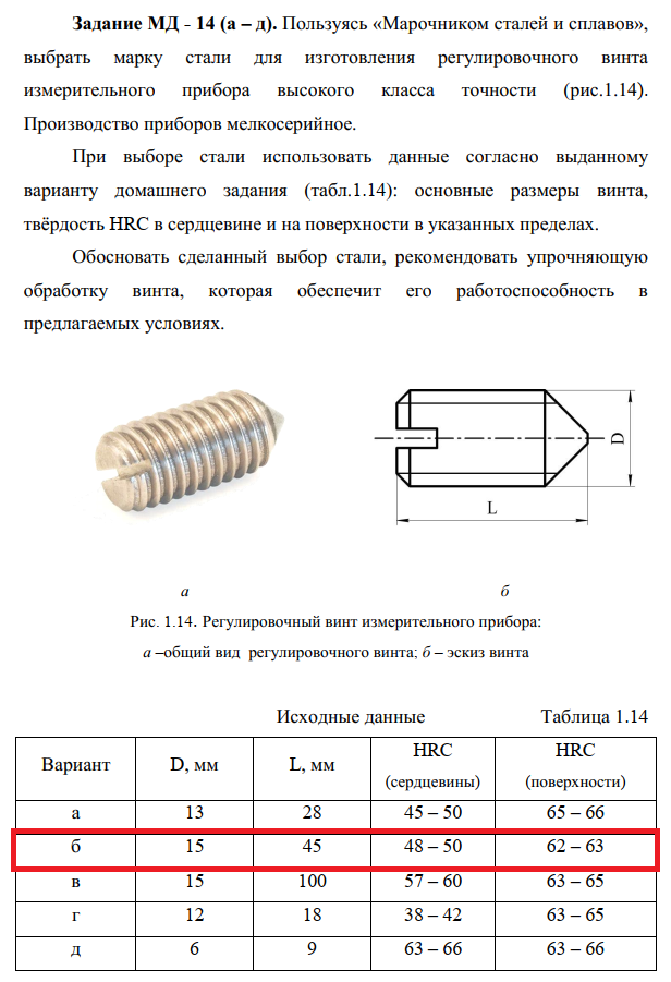 Задание МД - 1 4 (а – д). Пользуясь «Марочником сталей и сплавов», выбрать марку стали для изготовления регулировочного винта измерительного прибора высокого класса точности (рис.1.14).Производство приборов мелкосерийное. При выборе стали использовать данные согласно выданному варианту домашнего задания (табл.1.14): основные размеры винта, твёрдость HRC в сердцевине и на поверхности в указанных пределах. Обосновать сделанный выбор стали, рекомендовать упрочняющую обработку винта, которая обеспечит его работоспособность в предлагаемых условиях..