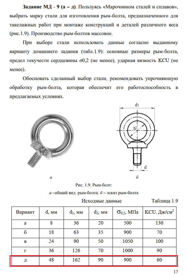 Задание МД - 9 (а – д). Пользуясь «Марочником сталей и сплавов», выбрать марку стали для изготовления рым-болта, предназначенного для такелажных работ при монтаже конструкций и деталей различного веса (рис.1.9). Производство рым-болтов массовое. При выборе стали использовать данные согласно выданному варианту домашнего задания (табл.1.9): основные размеры рым-болта, предел текучести сердцевины σ0,2 (не менее), ударная вязкость KCU (не менее). Обосновать сделанный выбор стали, рекомендовать упрочняющую обработку рым-болта, которая обеспечит его работоспособность в предлагаемых условиях..