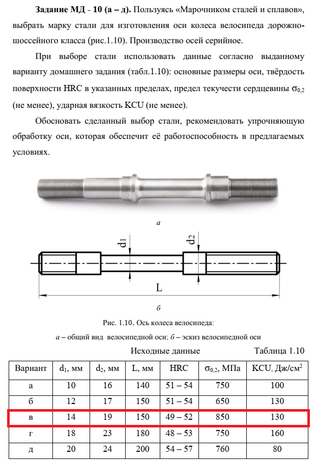 Задание МД - 1 0 (а – д). Пользуясь «Марочником сталей и сплавов», выбрать марку стали для изготовления оси колеса велосипеда дорожношоссейного класса (рис.1.10). Производство осей серийное. При выборе стали использовать данные согласно выданному варианту домашнего задания (табл.1.10): основные размеры оси, твёрдость поверхности HRC в указанных пределах, предел текучести сердцевины σ0,2 (не менее), ударная вязкость KCU (не менее). Обосновать сделанный выбор стали, рекомендовать упрочняющую обработку оси, которая обеспечит её работоспособность в предлагаемых условиях ..