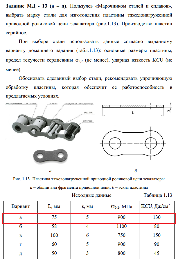 Задание МД - 13 (а – д). Пользуясь «Марочником сталей и сплавов», выбрать марку стали для изготовления пластины тяжелонагруженной приводной роликовой цепи эскалатора (рис.1.13). Производство пластин серийное. При выборе стали использовать данные согласно выданному варианту домашнего задания (табл.1.13): основные размеры пластины, предел текучести сердцевины σ0,2 (не менее), ударная вязкость KCU (не менее). Обосновать сделанный выбор стали, рекомендовать упрочняющую обработку пластины, которая обеспечит ее работоспособность в предлагаемых условиях..