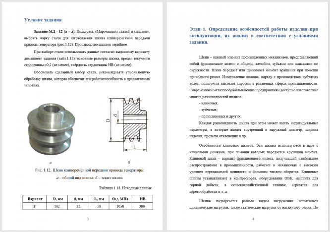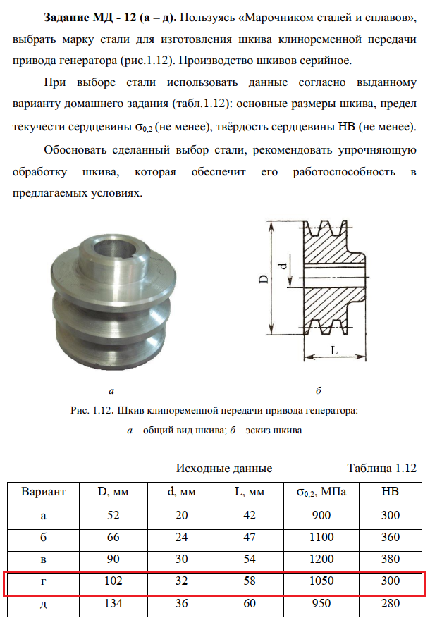 Задание МД - 12 (а – д). Пользуясь «Марочником сталей и сплавов», выбрать марку стали для изготовления шкива клиноременной передачи привода генератора (рис.1.12). Производство шкивов серийное. При выборе стали использовать данные согласно выданному варианту домашнего задания (табл.1.12): основные размеры шкива, предел текучести сердцевины σ0,2 (не менее), твёрдость сердцевины HB (не менее). Обосновать сделанный выбор стали, рекомендовать упрочняющую обработку шкива, которая обеспечит его работоспособность в предлагаемых условиях. .