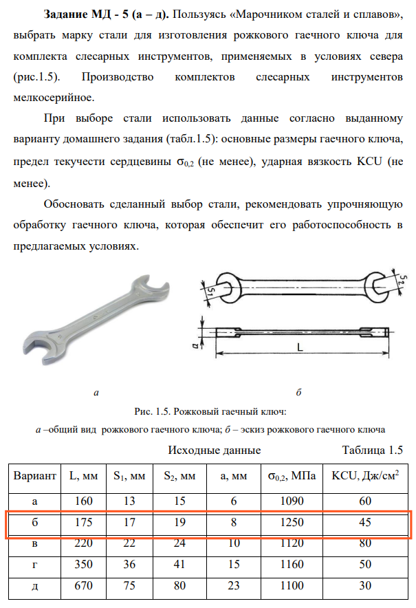 Задание МД - 5 (а – д). Пользуясь «Марочником сталей и сплавов», выбрать марку стали для изготовления рожкового гаечного ключа для комплекта слесарных инструментов, применяемых в условиях севера (рис.1.5). Производство комплектов слесарных инструментов мелкосерийное. При выборе стали использовать данные согласно выданному варианту домашнего задания (табл.1.5): основные размеры гаечного ключа, предел текучести сердцевины σ0,2 (не менее), ударная вязкость KCU (не менее).            Обосновать сделанный выбор стали, рекомендовать упрочняющую обработку гаечного ключа, которая обеспечит его работоспособность в предлагаемых условиях.  .