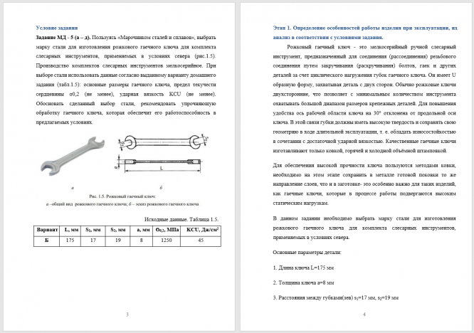 Задание МД - 5 (а – д). Пользуясь «Марочником сталей и сплавов», выбрать марку стали для изготовления рожкового гаечного ключа для комплекта слесарных инструментов, применяемых в условиях севера (рис.1.5). Производство комплектов слесарных инструментов мелкосерийное. При выборе стали использовать данные согласно выданному варианту домашнего задания (табл.1.5): основные размеры гаечного ключа, предел текучести сердцевины σ0,2 (не менее), ударная вязкость KCU (не менее). Обосновать сделанный выбор стали, рекомендовать упрочняющую обработку гаечного ключа, которая обеспечит его работоспособность в предлагаемых условиях. .