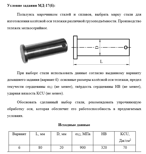 При выборе стали использовать данные согласно выданному варианту домашнего задания (вариант б): основные размеры колёсной оси тележки, предел текучести сердцевины σ0,2 (не менее), твёрдость сердцевины HB (не менее), ударная вязкость KCU (не менее).