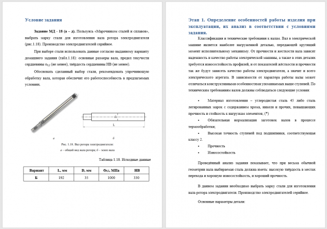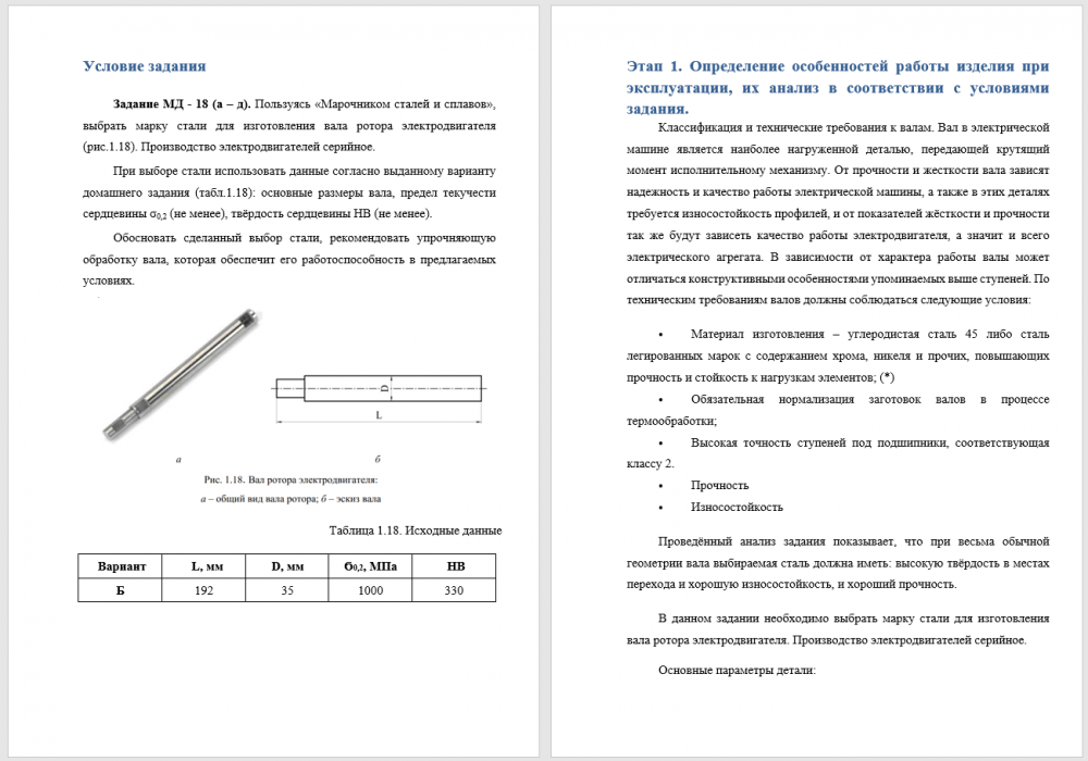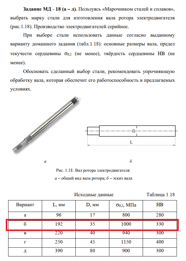 Задание МД - 18 (а – д). Пользуясь «Марочником сталей и сплавов», выбрать марку стали для изготовления вала ротора электродвигателя (рис.1.18). Производство электродвигателей серийное. При выборе стали использовать данные согласно выданному варианту домашнего задания (табл.1.18): основные размеры вала, предел текучести сердцевины σ0,2 (не менее), твёрдость сердцевины HB (не менее). Обосновать сделанный выбор стали, рекомендовать упрочняющую обработку вала, которая обеспечит его работоспособность в предлагаемых условиях..