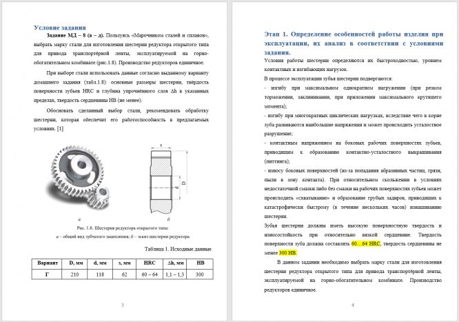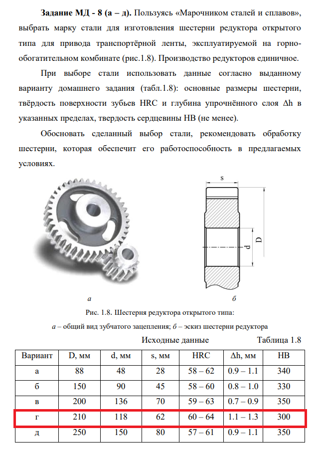 Задание МД – 8 (а – д). Пользуясь «Марочником сталей и сплавов», выбрать марку стали для изготовления шестерни редуктора открытого типа для привода транспортёрной ленты, эксплуатируемой на горно-обогатительном комбинате (рис.1.8). Производство редукторов единичное. При выборе стали использовать данные согласно выданному варианту домашнего задания (табл.1.8): основные размеры шестерни, твёрдость поверхности зубьев HRC и глубина упрочнённого слоя Δh в указанных пределах, твердость сердцевины НВ (не менее). Обосновать сделанный выбор стали, рекомендовать обработку шестерни, которая обеспечит его работоспособность в предлагаемых условиях. .
