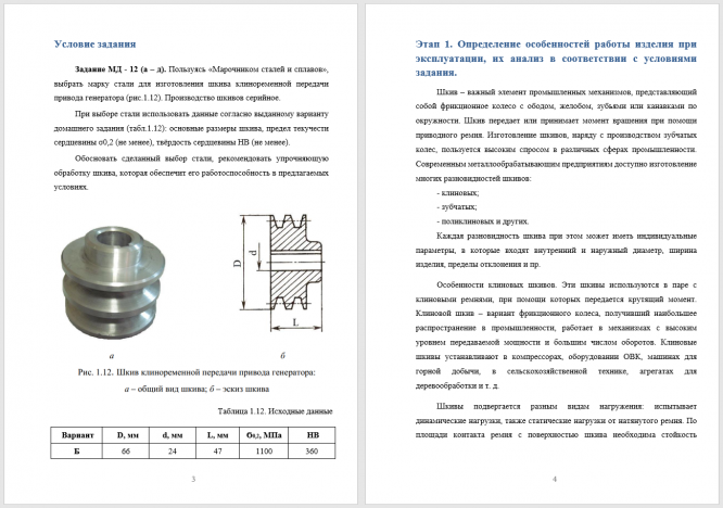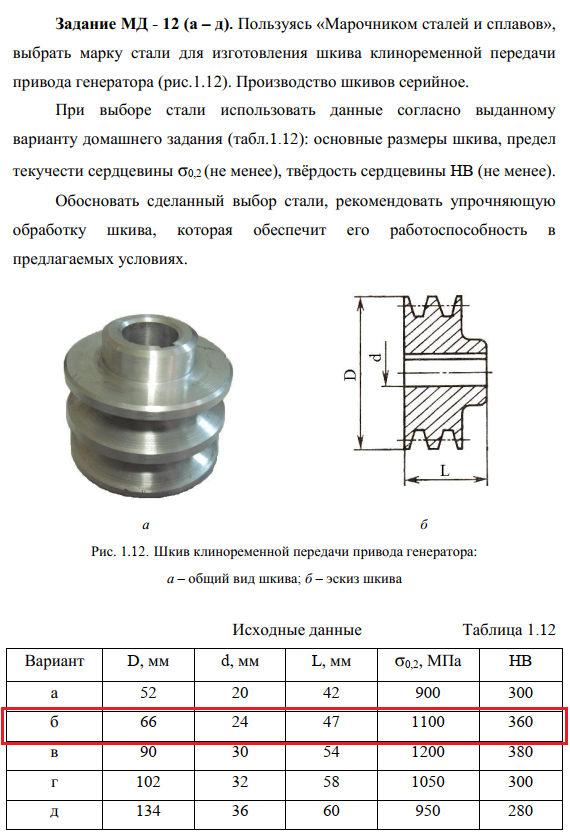 Задание МД - 12 (а – д). Пользуясь «Марочником сталей и сплавов», выбрать марку стали для изготовления шкива клиноременной передачи привода генератора (рис.1.12). Производство шкивов серийное. При выборе стали использовать данные согласно выданному варианту домашнего задания (табл.1.12): основные размеры шкива, предел текучести сердцевины σ0,2 (не менее), твёрдость сердцевины HB (не менее). Обосновать сделанный выбор стали, рекомендовать упрочняющую обработку шкива, которая обеспечит его работоспособность в предлагаемых условиях..