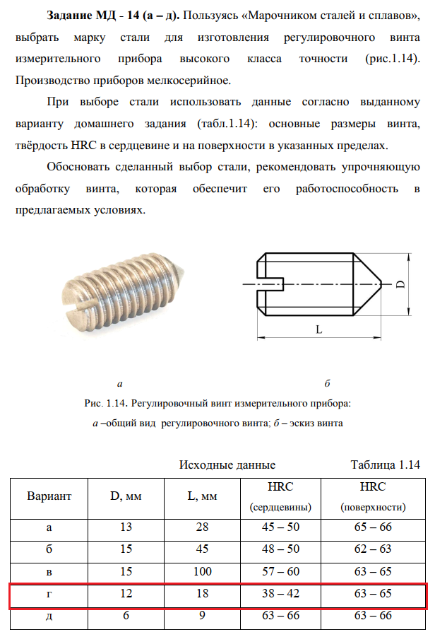 Задание МД - 1 4 (а – д). Пользуясь «Марочником сталей и сплавов», выбрать марку стали для изготовления регулировочного винта измерительного прибора высокого класса точности (рис.1.14).Производство приборов мелкосерийное. При выборе стали использовать данные согласно выданному варианту домашнего задания (табл.1.14): основные размеры винта, твёрдость HRC в сердцевине и на поверхности в указанных пределах. Обосновать сделанный выбор стали, рекомендовать упрочняющую обработку винта, которая обеспечит его работоспособность в предлагаемых условиях..