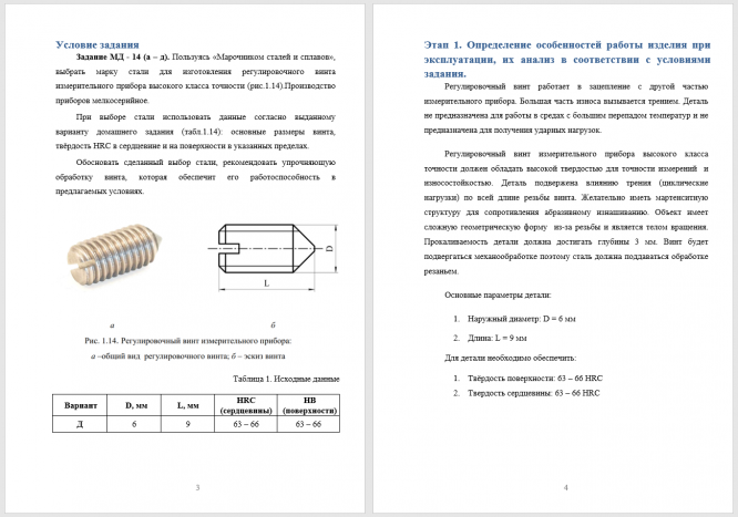 Задание МД - 1 4 (а – д). Пользуясь «Марочником сталей и сплавов», выбрать марку стали для изготовления регулировочного винта измерительного прибора высокого класса точности (рис.1.14).Производство приборов мелкосерийное. При выборе стали использовать данные согласно выданному варианту домашнего задания (табл.1.14): основные размеры винта, твёрдость HRC в сердцевине и на поверхности в указанных пределах. Обосновать сделанный выбор стали, рекомендовать упрочняющую обработку винта, которая обеспечит его работоспособность в предлагаемых условиях..