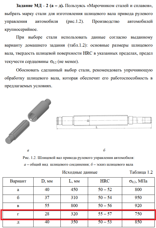 Задание МД – 2 (а – д). Пользуясь марочником сталей и сплавов, выбрать марку стали для изготовления шлицевого вала привода рулевого управления автомобиля (рис. 1.2). Производство автомобилей крупносерийное. При выборе стали использовать данные согласно выданному варианту домашнего задания: основные размеры шлицевого вала, твердость шлицевой поверхности HRC в указанных пределах, предел текучести  сердцевины (не менее). Обосновать сделанный выбор стали, рекомендовать упрочняющую обработку шлицевого вала, которая обеспечит его работоспособность в предлагаемых условиях..