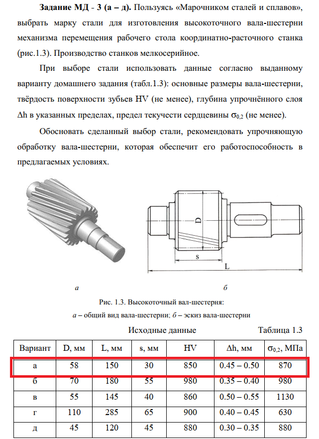 Задание МД - 3 (а – д). Пользуясь «Марочником сталей и сплавов», выбрать марку стали для изготовления высокоточного вала-шестерни механизма перемещения рабочего стола координатно-расточного станка (рис.1.3). Производство станков мелкосерийное. При выборе стали использовать данные согласно выданному варианту домашнего задания (табл.1.3): основные размеры вала-шестерни, твёрдость поверхности зубьев HV (не менее), глубина упрочнённого слоя Δh в указанных пределах, предел текучести сердцевины σ0,2 (не менее). Обосновать сделанный выбор стали, рекомендовать упрочняющую обработку вала-шестерни, которая обеспечит его работоспособность в предлагаемых условиях.