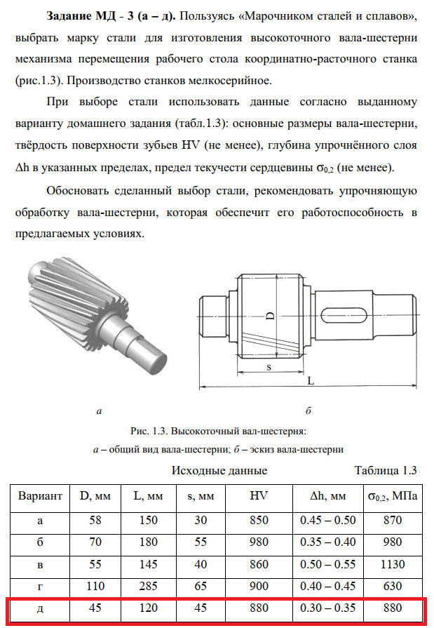 Задание МД - 3 (а – д). Пользуясь «Марочником сталей и сплавов», выбрать марку стали для изготовления высокоточного вала-шестерни механизма перемещения рабочего стола координатно-расточного станка (рис.1.3). Производство станков мелкосерийное. При выборе стали использовать данные согласно выданному варианту домашнего задания (табл.1.3): основные размеры вала-шестерни, твёрдость поверхности зубьев HV (не менее), глубина упрочнённого слоя Δh в указанных пределах, предел текучести сердцевины σ0,2 (не менее). Обосновать сделанный выбор стали, рекомендовать упрочняющую обработку вала-шестерни, которая обеспечит его работоспособность в предлагаемых условиях.