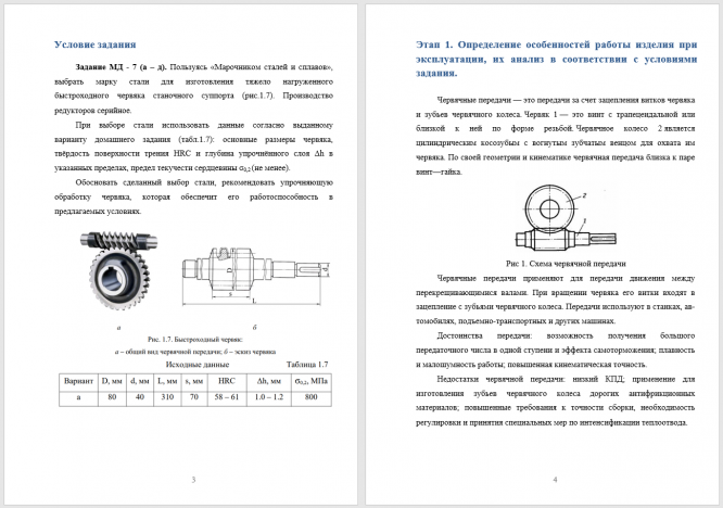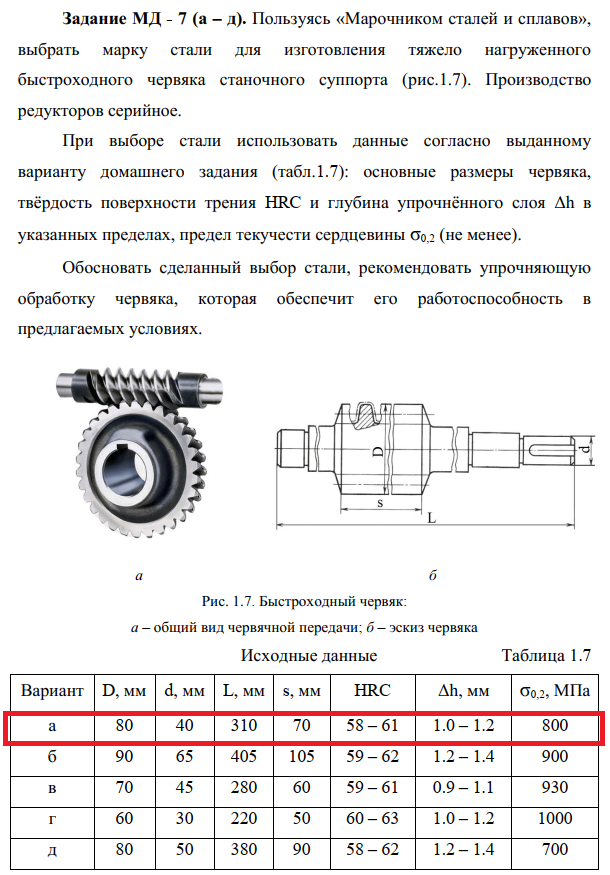 Задание МД - 7 (а – д). Пользуясь «Марочником сталей и сплавов», выбрать марку стали для изготовления тяжело нагруженного быстроходного червяка станочного суппорта (рис.1.7). Производство редукторов серийное. При выборе стали использовать данные согласно выданному варианту домашнего задания (табл.1.7): основные размеры червяка, твёрдость поверхности трения HRC и глубина упрочнённого слоя Δh в указанных пределах, предел текучести сердцевины σ0,2 (не менее). Обосновать сделанный выбор стали, рекомендовать упрочняющую обработку червяка, которая обеспечит его работоспособность в предлагаемых условиях. .