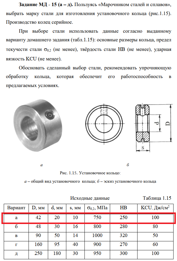 Задание МД - 15 (а – д). Пользуясь «Марочником сталей и сплавов», выбрать марку стали для изготовления установочного кольца (рис.1.15).Производство колец серийное. При выборе стали использовать данные согласно выданному варианту домашнего задания (табл.1.15): основные размеры кольца, предел текучести стали σ0,2 (не менее), твёрдость стали HB (не менее), ударная вязкость KCU (не менее). Обосновать сделанный выбор стали, рекомендовать упрочняющую обработку кольца, которая обеспечит его работоспособность в предлагаемых условиях ..