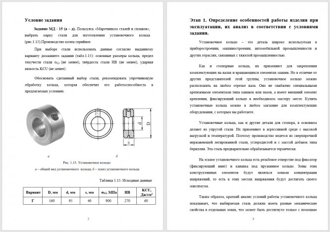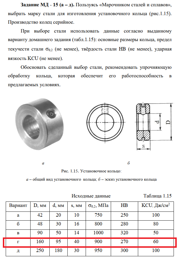 Задание МД - 15 (а – д). Пользуясь «Марочником сталей и сплавов», выбрать марку стали для изготовления установочного кольца (рис.1.15).Производство колец серийное. При выборе стали использовать данные согласно выданному варианту домашнего задания (табл.1.15): основные размеры кольца, предел текучести стали σ0,2 (не менее), твёрдость стали HB (не менее), ударная вязкость KCU (не менее). Обосновать сделанный выбор стали, рекомендовать упрочняющую обработку кольца, которая обеспечит его работоспособность в предлагаемых условиях..
