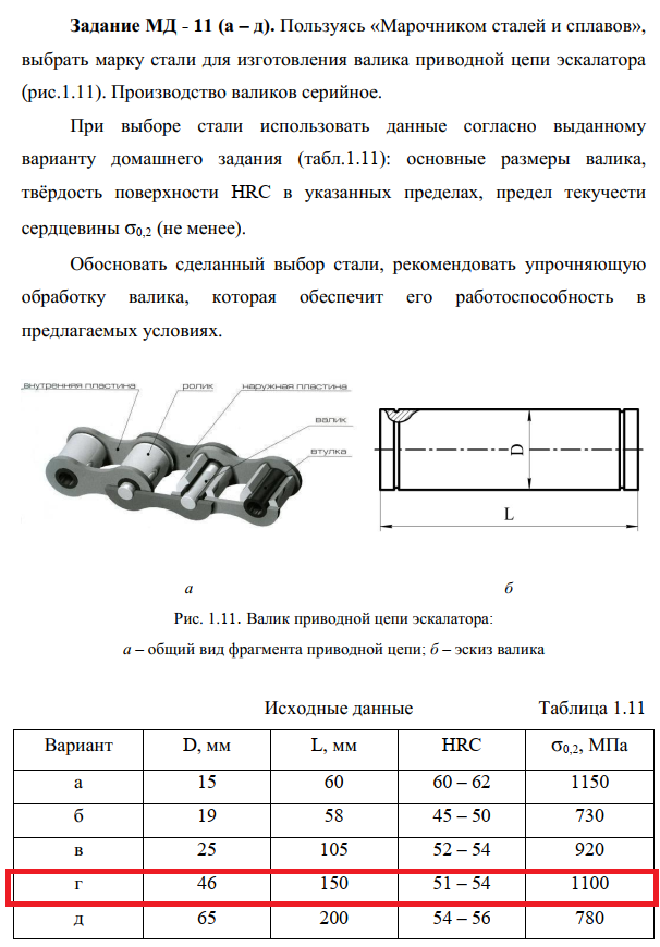 Задание МД - 11 (а – д). Пользуясь «Марочником сталей и сплавов», выбрать марку стали для изготовления валика приводной цепи эскалатора (рис.1.11). Производство валиков серийное. При выборе стали использовать данные согласно выданному варианту домашнего задания (табл.1.11): основные размеры валика, твёрдость поверхности HRC в указанных пределах, предел текучести сердцевины σ0,2 (не менее). Обосновать сделанный выбор стали, рекомендовать упрочняющую обработку валика, которая обеспечит его работоспособность в предлагаемых условиях..