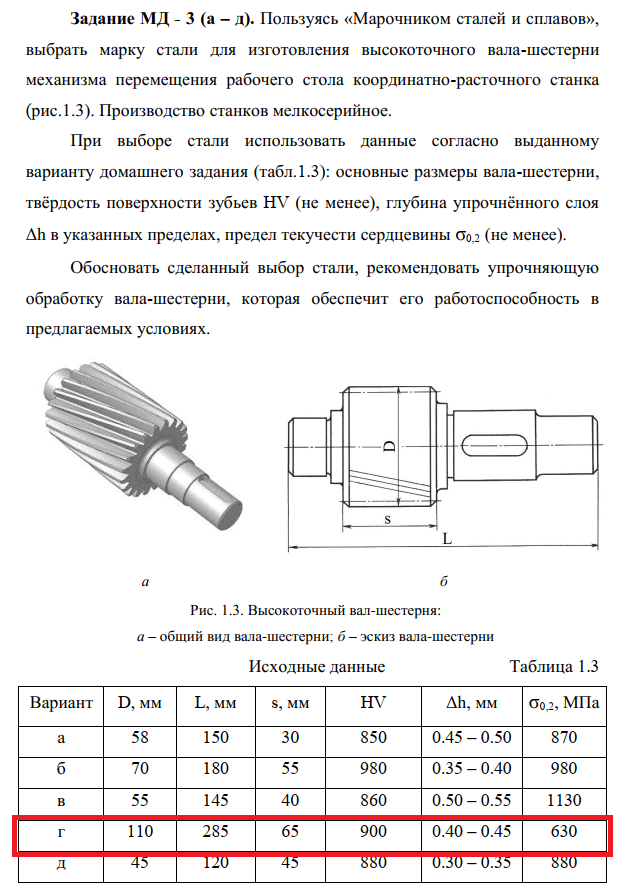 Задание МД - 3 (а – д). Пользуясь «Марочником сталей и сплавов», выбрать марку стали для изготовления высокоточного вала-шестерни механизма перемещения рабочего стола координатно-расточного станка (рис.1.3). Производство станков мелкосерийное. При выборе стали использовать данные согласно выданному варианту домашнего задания (табл.1.3): основные размеры вала-шестерни, твёрдость поверхности зубьев HV (не менее), глубина упрочнённого слоя Δh в указанных пределах, предел текучести сердцевины σ0,2 (не менее). Обосновать сделанный выбор стали, рекомендовать упрочняющую обработку вала-шестерни, которая обеспечит его работоспособность в предлагаемых условиях.