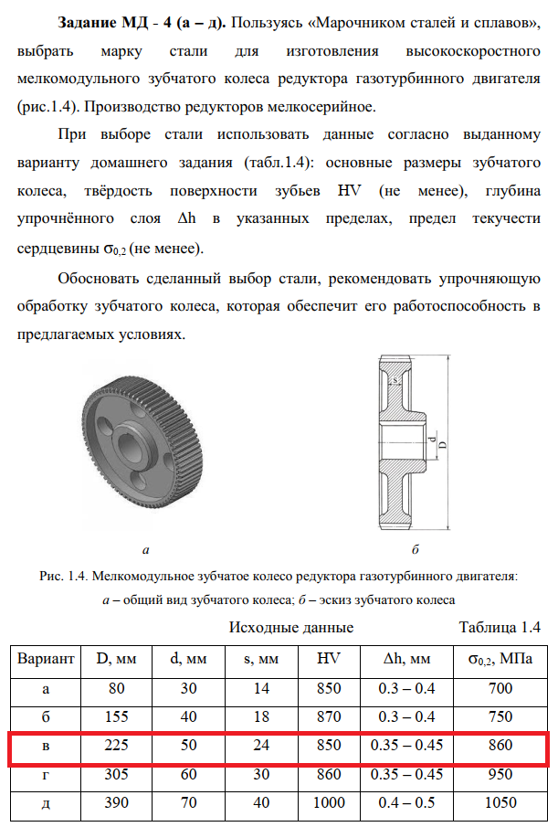 Задание МД - 4 (а – д). Пользуясь «Марочником сталей и сплавов», выбрать марку стали для изготовления высокоскоростного мелкомодульного зубчатого колеса редуктора газотурбинного двигателя (рис.1.4). Производство редукторов мелкосерийное. При выборе стали использовать данные согласно выданному варианту домашнего задания (табл.1.4): основные размеры зубчатого колеса, твёрдость поверхности зубьев HV (не менее), глубина упрочнённого слоя Δh в указанных пределах, предел текучести сердцевины σ0,2 (не менее). Обосновать сделанный выбор стали, рекомендовать упрочняющую обработку зубчатого колеса, которая обеспечит его работоспособность в предлагаемых условиях. .