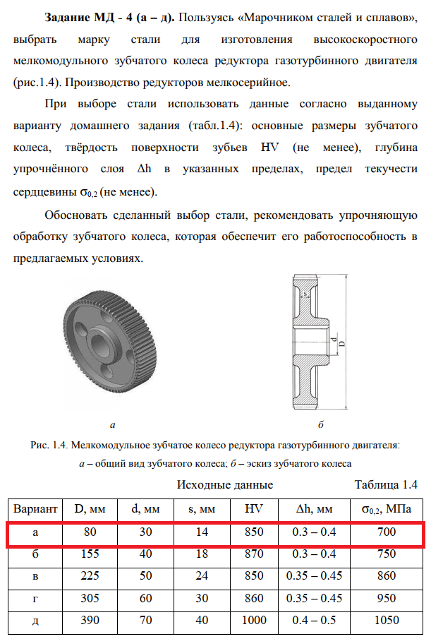Задание МД - 4 (а – д). Пользуясь «Марочником сталей и сплавов», выбрать марку стали для изготовления высокоскоростного мелкомодульного зубчатого колеса редуктора газотурбинного двигателя (рис.1.4). Производство редукторов мелкосерийное. При выборе стали использовать данные согласно выданному варианту домашнего задания (табл.1.4): основные размеры зубчатого колеса, твёрдость поверхности зубьев HV (не менее), глубина упрочнённого слоя Δh в указанных пределах, предел текучести сердцевины σ0,2 (не менее). Обосновать сделанный выбор стали, рекомендовать упрочняющую обработку зубчатого колеса, которая обеспечит его работоспособность в предлагаемых условиях. .