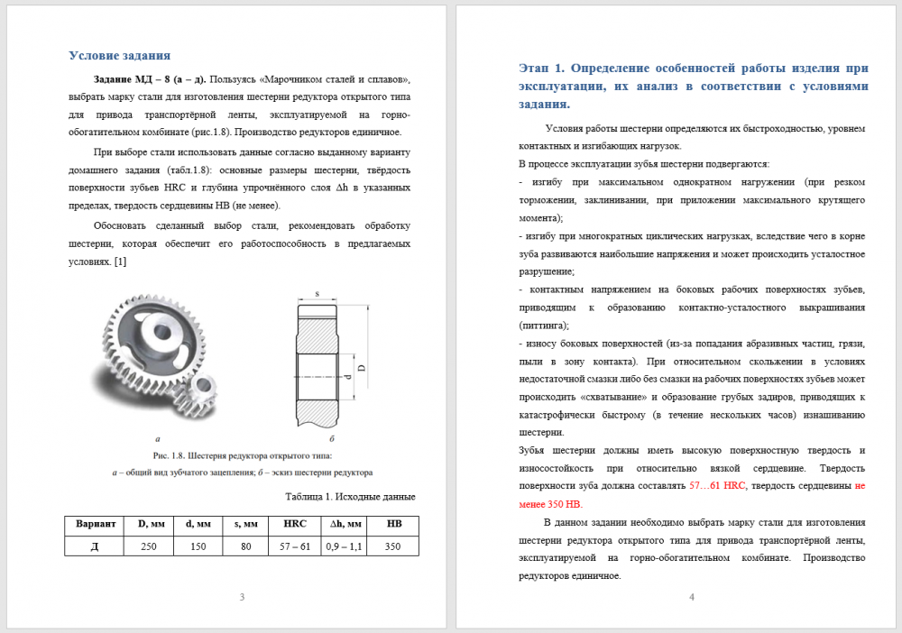 Задание МД – 8 (а – д). Пользуясь «Марочником сталей и сплавов», выбрать марку стали для изготовления шестерни редуктора открытого типа для привода транспортёрной ленты, эксплуатируемой на горно-обогатительном комбинате (рис.1.8). Производство редукторов единичное. При выборе стали использовать данные согласно выданному варианту домашнего задания (табл.1.8): основные размеры шестерни, твёрдость поверхности зубьев HRC и глубина упрочнённого слоя Δh в указанных пределах, твердость сердцевины НВ (не менее). Обосновать сделанный выбор стали, рекомендовать обработку шестерни, которая обеспечит его работоспособность в предлагаемых условиях. .