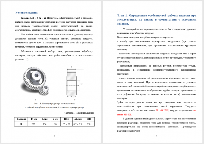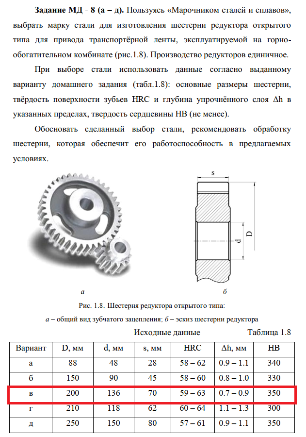Задание МД – 8 (а – д). Пользуясь «Марочником сталей и сплавов», выбрать марку стали для изготовления шестерни редуктора открытого типа для привода транспортёрной ленты, эксплуатируемой на горно-обогатительном комбинате (рис.1.8). Производство редукторов единичное. При выборе стали использовать данные согласно выданному варианту домашнего задания (табл.1.8): основные размеры шестерни, твёрдость поверхности зубьев HRC и глубина упрочнённого слоя Δh в указанных пределах, твердость сердцевины НВ (не менее). Обосновать сделанный выбор стали, рекомендовать обработку шестерни, которая обеспечит его работоспособность в предлагаемых условиях. .