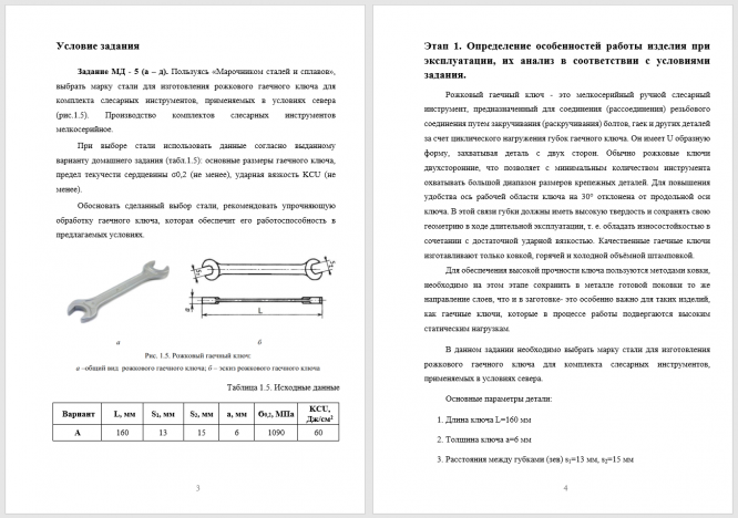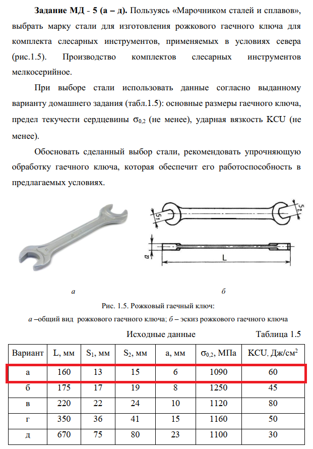 Задание МД - 5 (а – д). Пользуясь «Марочником сталей и сплавов», выбрать марку стали для изготовления рожкового гаечного ключа для комплекта слесарных инструментов, применяемых в условиях севера (рис.1.5). Производство комплектов слесарных инструментов мелкосерийное. При выборе стали использовать данные согласно выданному варианту домашнего задания (табл.1.5): основные размеры гаечного ключа, предел текучести сердцевины σ0,2 (не менее), ударная вязкость KCU (не менее).            Обосновать сделанный выбор стали, рекомендовать упрочняющую обработку гаечного ключа, которая обеспечит его работоспособность в предлагаемых условиях.  .