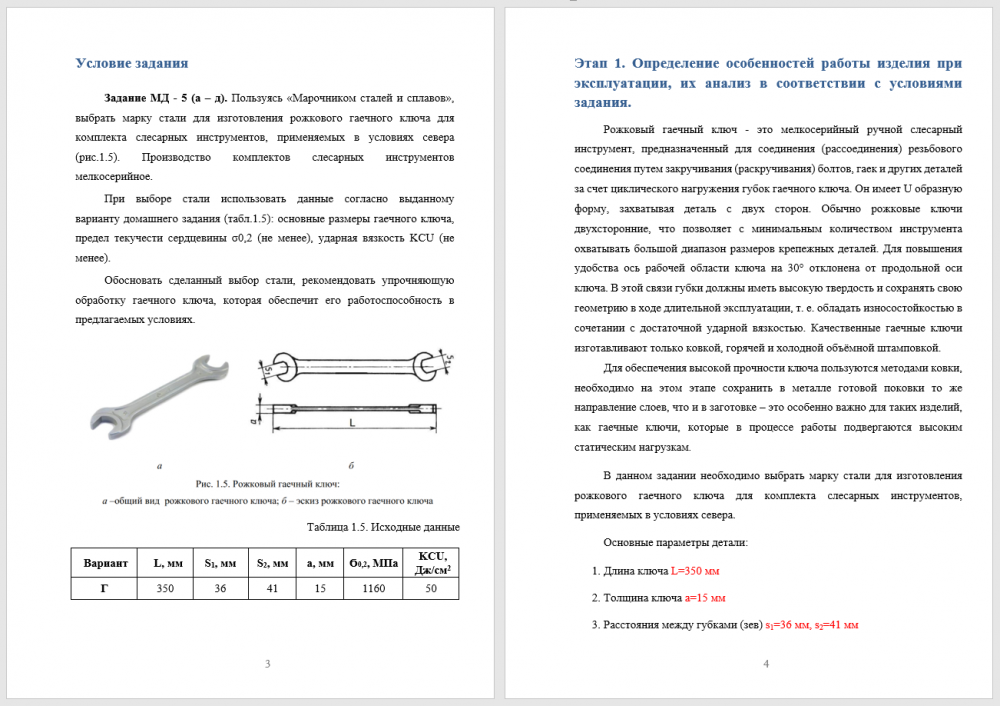 Задание МД - 5 (а – д). Пользуясь «Марочником сталей и сплавов», выбрать марку стали для изготовления рожкового гаечного ключа для комплекта слесарных инструментов, применяемых в условиях севера (рис.1.5). Производство комплектов слесарных инструментов мелкосерийное. При выборе стали использовать данные согласно выданному варианту домашнего задания (табл.1.5): основные размеры гаечного ключа, предел текучести сердцевины σ0,2 (не менее), ударная вязкость KCU (не менее). Обосновать сделанный выбор стали, рекомендовать упрочняющую обработку гаечного ключа, которая обеспечит его работоспособность в предлагаемых условиях. .